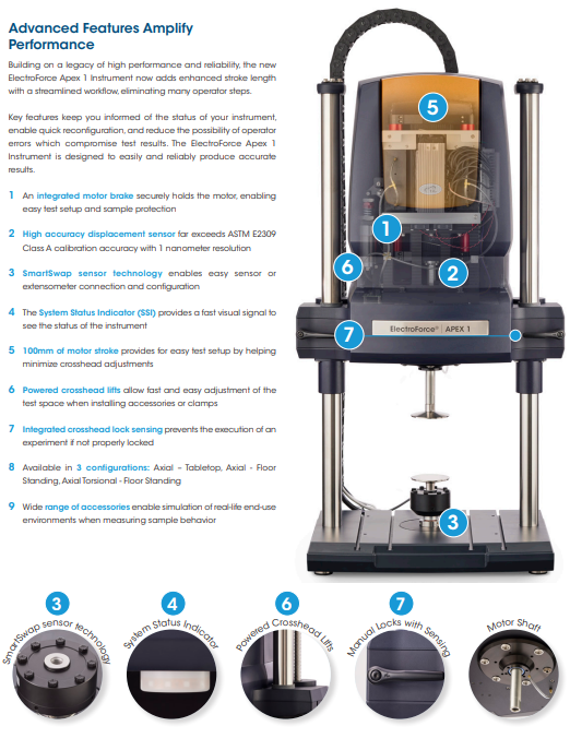 Thiết bị ElectroForce Apex 1 cho phép các nhà khoa học, kỹ sư và kỹ thuật viên nhanh chóng và tự tin đo lường, đánh giá các đặc tính cơ học thông qua các thử nghiệm kéo đơn điệu (còn gọi là thử kéo), thử mỏi và nhiều kỹ thuật đặc trưng vật liệu khác mà không cần đào tạo chuyên sâu.