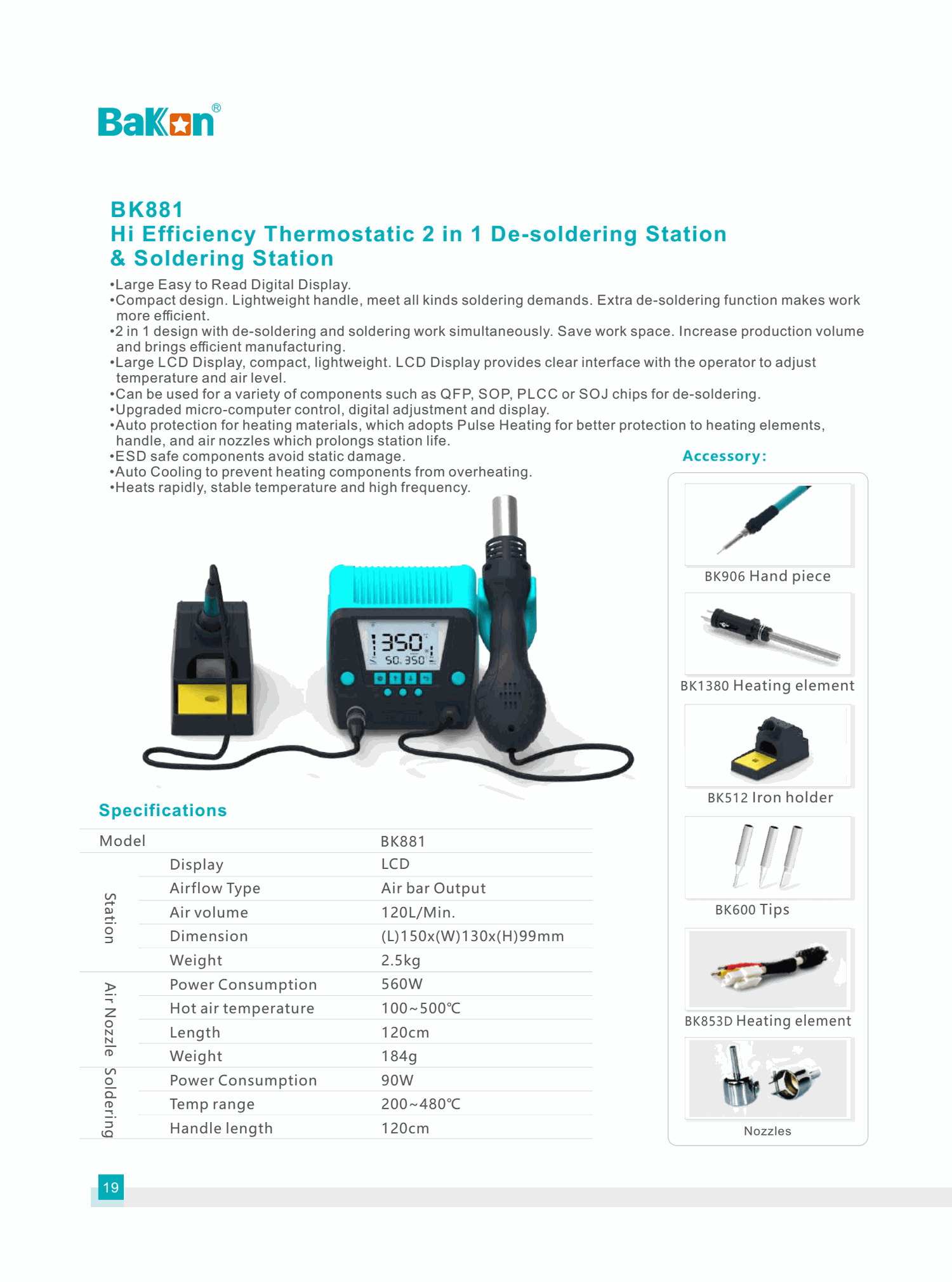 Bakon BK881 là trạm hàn đa năng tích hợp tay hàn thiếc và tay khò hơi nóng trong cùng một thiết bị, thiết kế nhỏ gọn, tiện lợi cho sửa chữa và gia công điện tử.